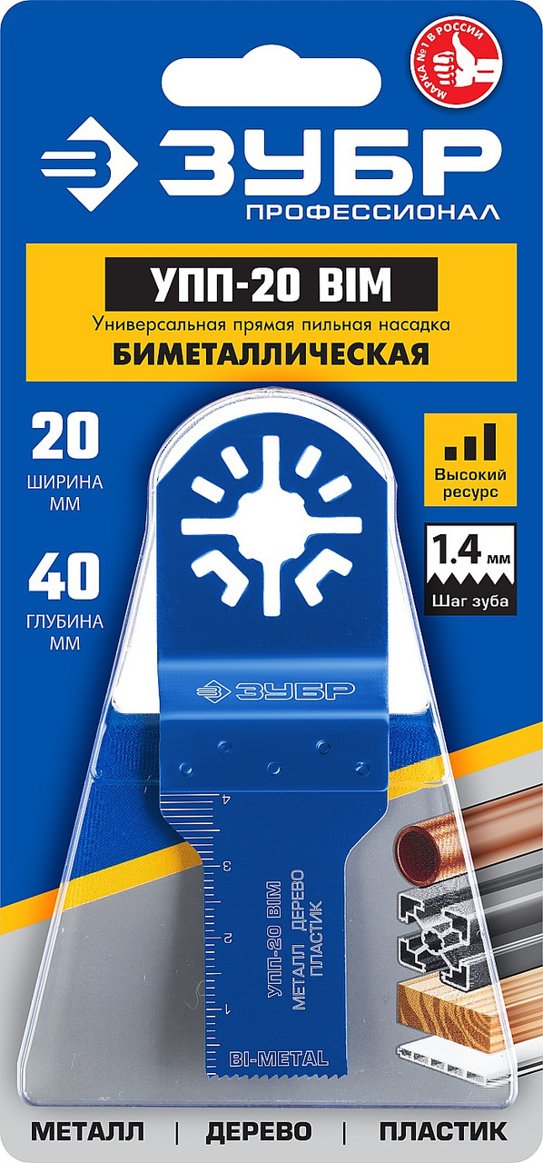 Универсальная прямая пильная насадка, 20 x 40 мм, ЗУБР Профессионал, УПП-20 BIM. Предназначена для резки металла, дерева, пластика. Насадка изготовлена из высококачественной Биметаллической стали на автоматизированных производственных линиях с применением новейших методов шлифовки, разводки и заточки зубьев.Характеристики