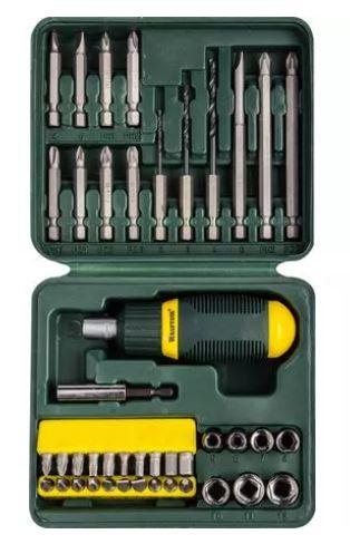 КОМПЛЕКТАЦИЯ:- Отвертка реверсивная - 1 шт. Удлинитель магнитный для бит - 1 шт. Адаптер для головок - 1 шт. Торцевые головки: 5, 6, 7, 8, 10, 11, 12 мм Биты по 25 мм: SL4, 6, 7; PH1, 2 х 2 шт., 3; PZ1, 2, 3; HEX 3, 4, 5, 6; TORX 9, 15, 20, 25, 30 - 19 шт. Биты по 50 мм